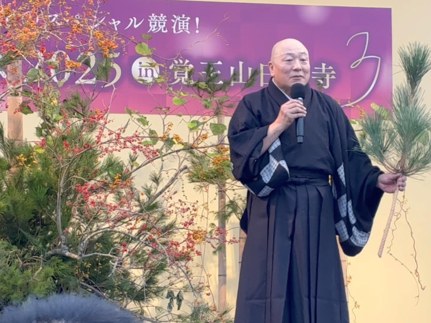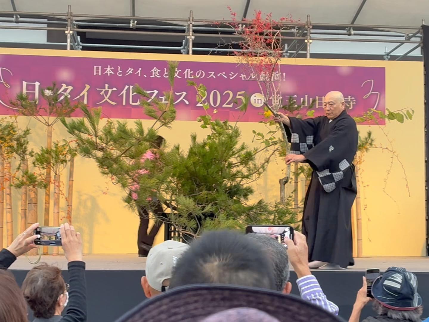 野村又三郎、信朗親子の狂言も披露していただきました。狂言に関する又三郎様のお話も興味深く、扇子の使い分けの話は実物を見せていただきながらの説明でした。